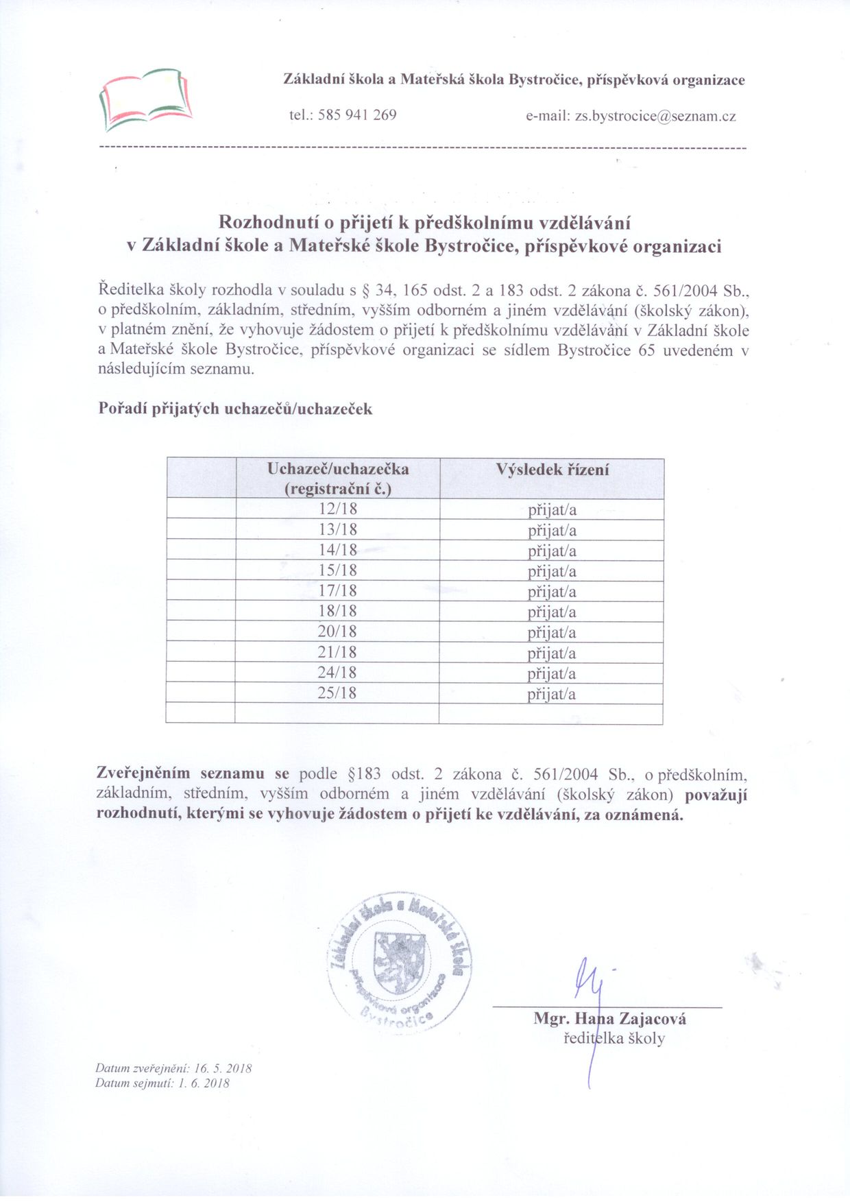 Rozhodnutí o přijetí k předškolnímu vzdělávání